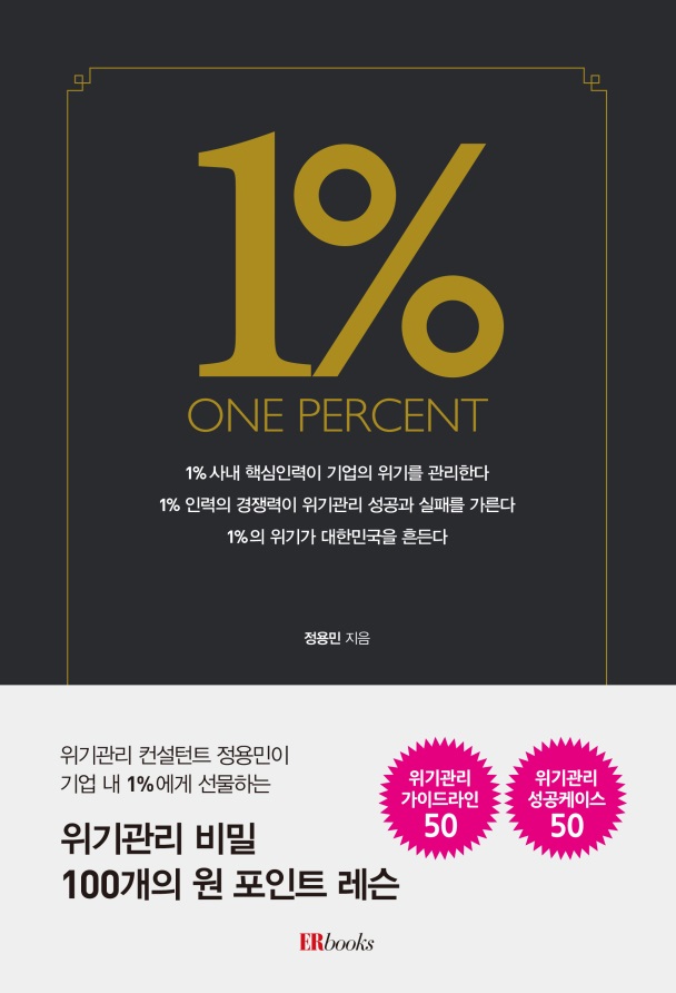 신간 <1%_ONE PERCENT>는 기업의 핵심 인력 1%를 지칭하는 의미로 붙여진 제목이다. 국내 대기업과 중견기업들의 전체 직원 수 기준 핵심 임원들의 비율은 1% 내외. 중소기업의 경우에도 실제 회사에 위기가 발생했을 때 이를 관리하는 핵심 인력은 1%안팎에 머무른다. 신간 <1%_ONE PERCENT>는 이 핵심 인력 1%에게 “평소에 관심을 가지고 조직과 자신의 위기관리 경쟁력을 키우라”고 강하게 조언한다.